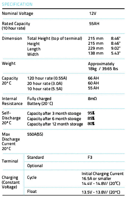 Betta/Deltec LEAD CRYSTAL Battery 12v 55 A/H @ 10hr rate, sealed, maintenance free and with a 3 year carry-in warranty against defective manufacturing.