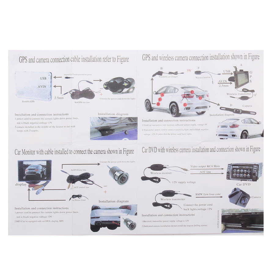 Specification: Model Number: B45720 Color: Black Camera Size: 60*30*22mm Power cable Length: approx. 58cm Wireless Transmitter Cable Length: 1.72M Wireless Receiver Cable Length: 1.72M Sensor:CCD Video System: NTSC Detachable Panel: No Lens Angle: 170?ᆪ Resolution: 420 TV Lines Power Supply: 12 V Power Consumption: 1.3 W Features: AV-IN Interface Port: AV Out Video Input: 2 channel S/N ratio: Better Than 48db Operation Temperature: -20?ᆪC - 80?ᆪC RH95% Max Waterproof: IP67 ? Feature: - 100% Brand new and high quality. - High sensitivity and low power consumption. - Night vision and water proof. - Excellent quality,it simply fits where the original number plate lights goes so NO DRILLING and just fit. - Wireless connection type,savaing your time,more faster and more easier,just take 5 minutes. ? Fitment: For Ford Transit /Transit Connect ? Installation Steps: 1.Connect the built-in number plate light of the camera to where the stock number plate light was connected to get the power. 2.Connect the wireless module (transmitter) to your camera via the two cables- yellow plug for AV output and red plug for power. 3.Connect the wireless module (transmitter) to the reverse light of your car to get the power - red wire for positive and black wire for negative. 4.Connect the wireless module (receiver) to your car monitor - yellow plug for AV input. 5.Connect the wireless module (receiver) to your car battery or c igarette lighter to get the power - red wire for positive and black wire for negative. 6.The image will shows when the car in reverse mode. ? Package Included: 1 x CCD Reversing Camera 1 x Power Cable 1 x Wireless Transmitter? 1 x Wireless Receiver 1 x Manual