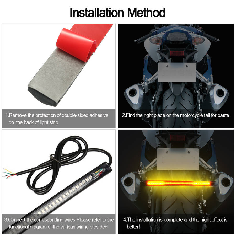 Description: Black line is the common negative. Running lights (or daytime running lights) - red light. Brake lights - red highlight. Left turn signal - left yellow light. Right turn signal - right yellow light. Led Light Position: License Plate Light, Led light color: Red for brake and stop, Amber for turn signal Fitment for Motorcycle Harley Davidson Bike ATV Car RV SUV, License Plate Lights, Car License Plate Lights, Trailer lights. Led light color: Red for brake and stop, Amber for turn signal, Lots of Common uses Specification: LED type: 32-3528 SMD 8' LED Material: Flexible Soft Rubbe Style: #1 48LED #2 36LED Color: Driving, red brake, turn yellow lights Scope: DC12-14V Waterproof IP: IP 65 Base Color: Black Specifications: Length * width * height: 20 * 1.4 * 1.3cm Model: MOZU-241A1(48 lamp beads) , MOZU-241B1(32 lamp beads) Installation instructions: double-sided adhesive fixed, flat surface can be used Wiring Connection Insctruction: Black line is the common negative. Running lights (or daytime running lights) - red light. Brake lights - red highlight. Left turn signal - left yellow light. Right turn signal - right yellow light. Package Included: 1 X Motorcycle LED Color Rear Taillights ![]() ![]() ![]() ![]() ![]() ![]() ![]() ![]() ![]() ![]() |