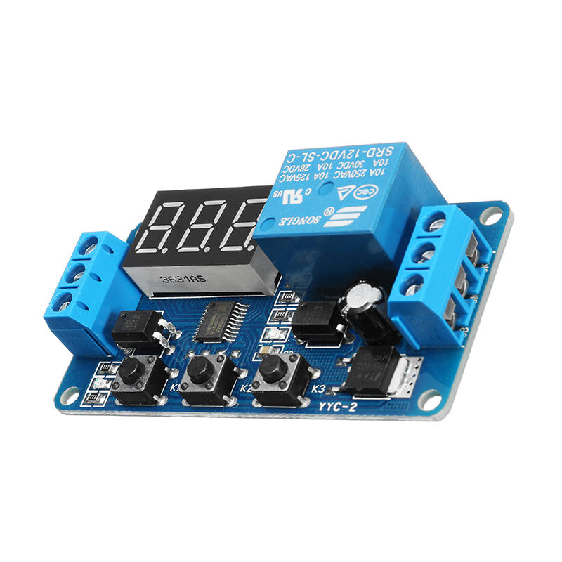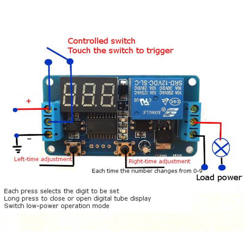 Turn on the power, LED lit, but the relay does not work, trigger the termination button or PNP sensor trigger, when there is a high level trigger (or the button is instantaneously connected to the positive power supply), the relay starts to work, the countdown delay, when the delay time arrive, the relay disconnects.