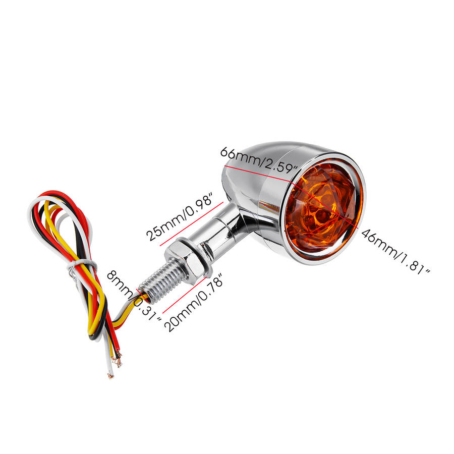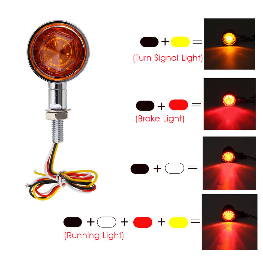 Specification: Product Name: Turn Signal Light Material: Aluminum Housing and Plastic Lens Voltage: 12V Dimension: 66mm x 46mm Wire Length: Mounting Bolt Thread: 8mm LED Quantity: 15pcs/per light Lens Color: Yellow Light Color: Yellow / Red / Yelllow + Red Housing Color: Chrome / Black Quantity: 2PCS 4 Wire Connection: Black - Negative Turn Signal Light - Yellow to positive Brake light - Red/White to positive (when you connect red wire the light is more brighter than the White wire) Running light- Yellow&Red&White together to positive Features: High quality, ultra bright LED light. Long lasting, low power consumption, energy saving. Enhance the look of your motorcycle with these turn signals. Can be used for brake and turn signal light function. Fitment: Universal Fit For Harley Dyna Bobber for Honda for Yamaha for Suzuki for Kawasaki motorcycle etc, with 10 mm mounting bolt thread use. Note: 1.We provide clear pictures, measurements where possible. Please check as much as possible to make sure the item is the one that you need. 2. Please allow 0.5-1 inch difference due to manual measurement.(1inch=2.54cm) 3.The color of the actual items may slightly different from the listing images due to different computer screen, thanks for your understanding. 4.Instruction is not included.Professional Installation Is Highly Recommended!!If you want to know how to use or install it,please contact us by Email.We will provide help as much as possible. Package Included: 2 x Turn Signal Lights