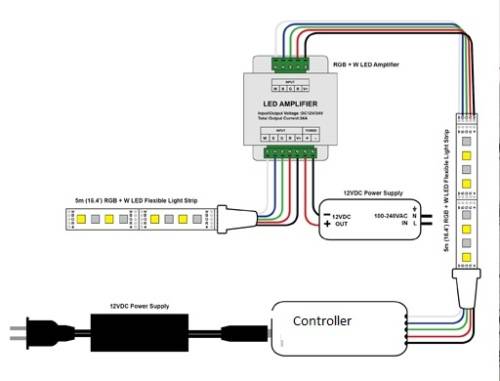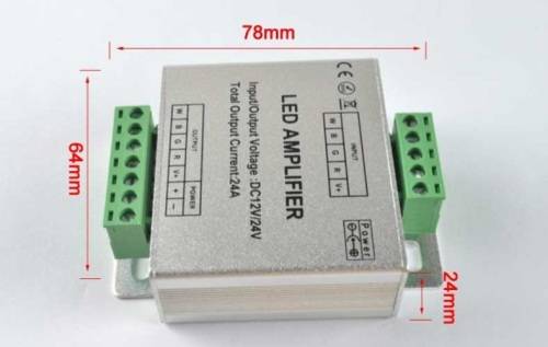Because of Voltage Drop in low voltage lighting, the LED strip will become less bright the longer you run it. Sometimes an amplifier is needed for long distance LED strip lighting installations so the dimming signal (or RGB signal) can be carried to the next run of lights.