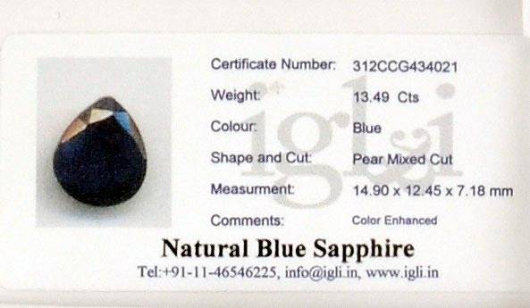 13.49 Carat IGLI Certified Blue Sapphire Gemstone