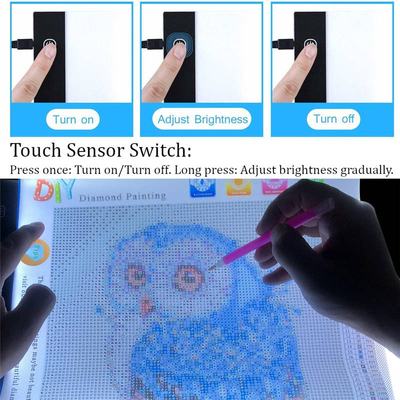 Features: *3 levels adjustable brightness of light box: Convenient for you choose the light that you need when you make a diamond painting. *Light pad stand holder: Made of aluminium alloy,plastic and rubber mat,which has wear resistant and non-slip function, you can also adjust its angle and width according to your needs, it can apply to 10-17inch laptop or 8-10inch tablet PC. Size: Light Pad(WxL):333x215x3mm