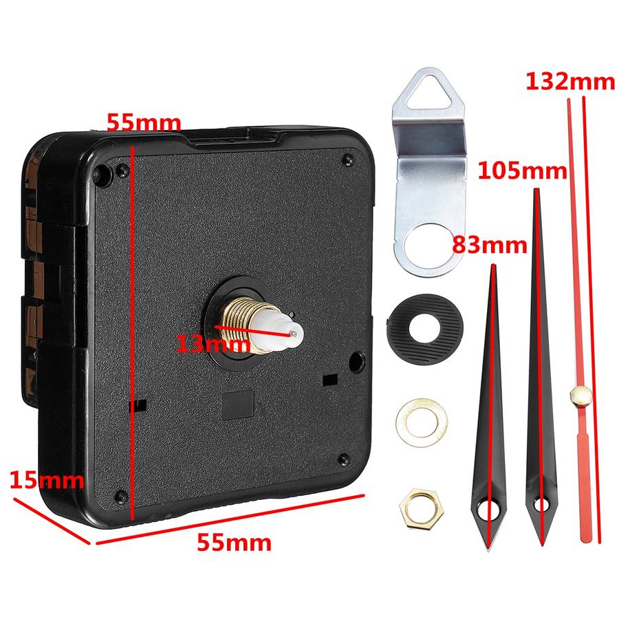 Specification: Material: Plastic + Aluminum Mode: Silent Mode Host Size: About 55x55x15 mm/2.16x2.16x0.59'' Second hand length: 132mm/5.2'' Minute hand length: 105mm/4.13'' Hour hand length: 83mm/3.27'' Spindle length: 13mm/0.51'' Battery: Not Included Features: 1.Quality quartz clock movement,long lifetime guaranteed 2.Ideal for replacing defective units or for creating your own personalized clock projects 3.Energy efficient. Accurate time keeping. Package Included: 1 x Quartz clock movement Kit
