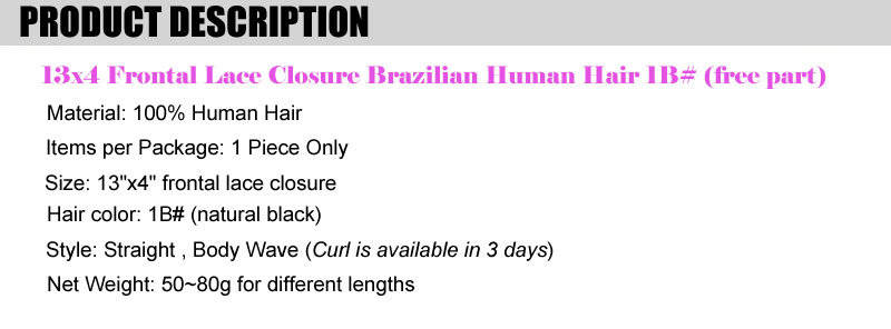 13x4 Frontal Lace Human Hair Closure Ear to Ear Closure 1B# 10"~ 20"