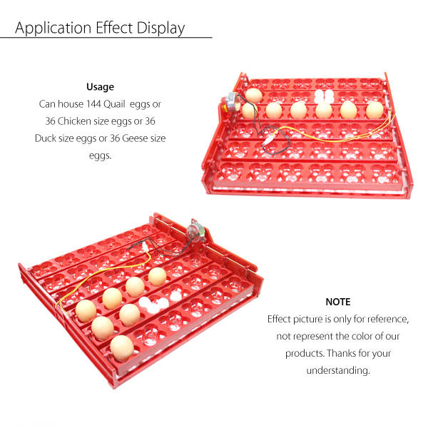 Features: 1.Can house 144 Quail eggs or 36 Chicken size eggs or 36 Duck size eggs or 36 Geese size eggs. 2.Recycled plastic, more healthier. 3.Enables you to keep the egg tray clean and bacteria free for years of problem free incubation of your valuable eggs.