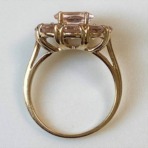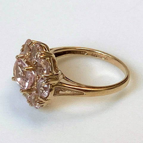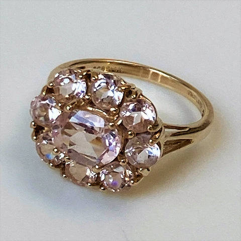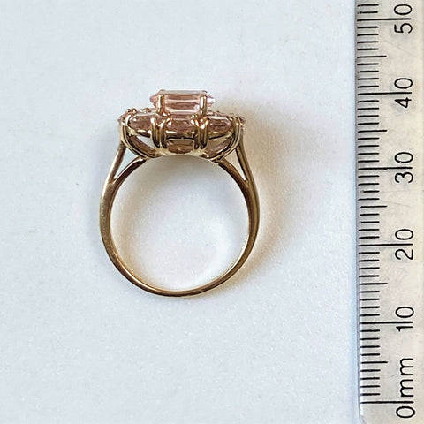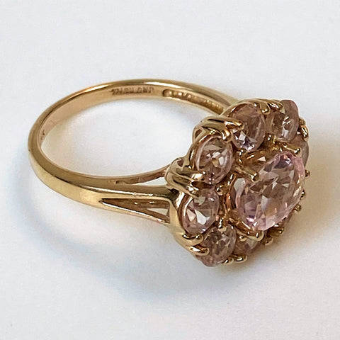 The modern, 14ct yellow gold ring has a central, oval-cut, morganite (approximately 8.0mm x 6.0mm circa 1.1ct) surrounded by eight round-cut morganite (approximately 4.0mm diameter circa 2.0ct total). The morganite are all orange-pink and eye-clear. The ring is marked SCBS14K; THAILAND. The metal has been electronically scanned and is confirmed to be 14ct gold.