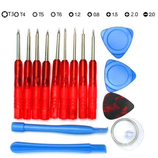 Package include: 1 x PVC Suction cup 1 x T4 Screwdriver 1 x T3 Screwdriver 1 x T5 Screwdriver 1 x T6 Screwdriver 1 x #00 Screwdriver 1 x 1.2 "+" Screwdriver 1 x Screwdriver - Slot (magnetic) 1 x Screwdriver - Phillips (magnetic) 1 x Pentalobe screwdriver (magnetic) for opening of Apple - Devices 2 x Open Tool 3 x Triangular Pry Tool
