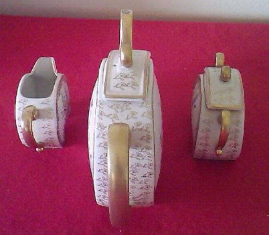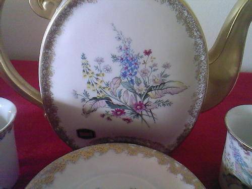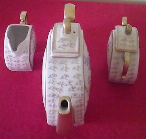 Be the envy of all with this most beautiful 15 piece hand painted mocha coffee set, presumably from a factory called Vermont, or Royal Vermont, in the pattern No. 2572C. A delicate spray of flowers on the palest pink background, with tiny gold flowers and bands of golden specks decorates these gorgeous items. The handles, spouts, feet and knobs are all gold in colour and all edges have been trimmed in gold.