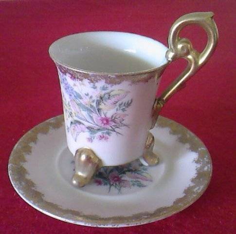 The cups have dainty golden feet and an ornate ear which stands above the cup. Cups measure 6cm to the top of the ear, with a diameter of 5.5cm. The saucer has a diameter of 10.5cm. There are 6 cups and saucers. The only damage is one tiny nick on the rim of one cup.