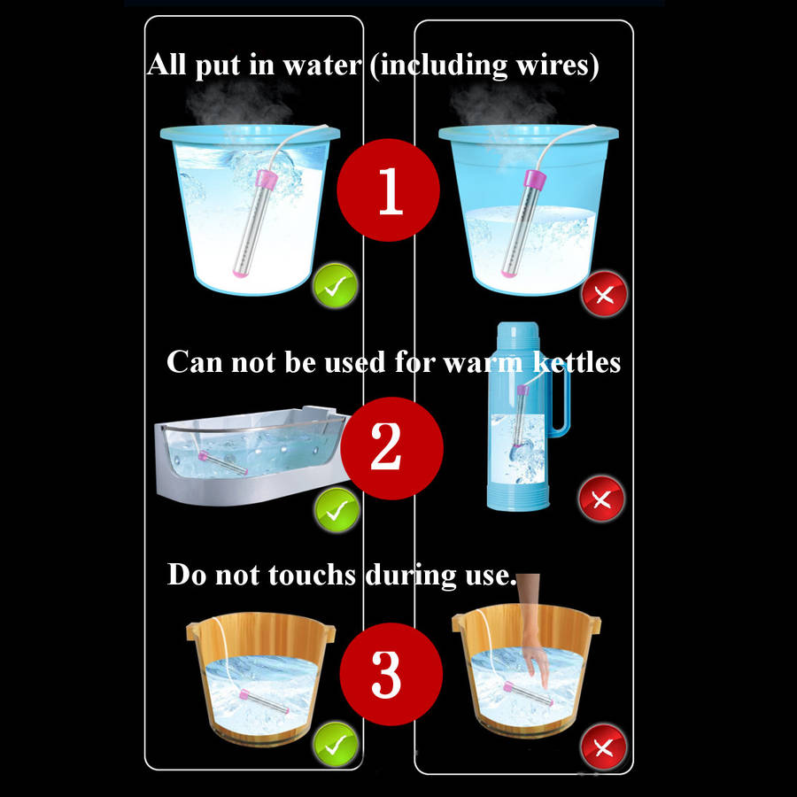 Attention: 1. When boiling water, it is forbidden to touch water and heated containers. Please unplug the plug and try the water temperature again. 2. Please ensure that the heating pipe must be completely in water and not dry-burn without water. 3. After the water is boiled, please unplug the power plug first, and then take out the heater. 4. When boiling water, please have someone to take care of it.