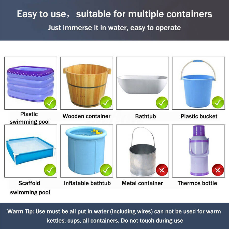 Feature: - 1500W/2000W High power,fast boiling water. - Anti-scalding and non-rusting. - Comprehensive anti-scalding design, uniform heat dissipation, prevent scalding. - Easy to use, suitable for multiple containers. Just immerse it in water, easy to operate. - All put in water (including wires) can not be used for warm kettles, cups, all containers. Do not touch during use.
