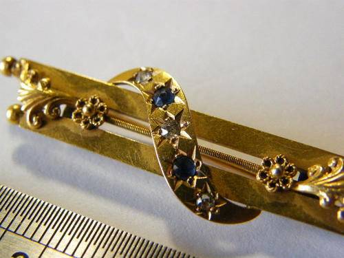 15kt Antique gold brooch with diamond and sapphires, 3.9grams