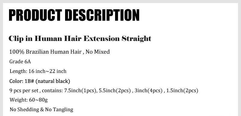 16~22 inch Clip-in Human Hair Extension Straight 1B# 9pcs/set