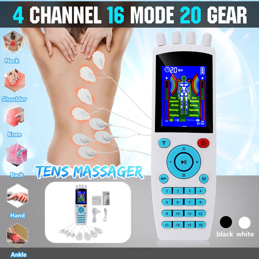 Package weight: 0.50 kg Specifications: - Device Material: ABS - Plug: US Plug, EU Plug - Color: White, Black - Rated Voltage: 5V - Recommended Massager Time: 15-30 minutes - Power Supply: USB Charge Function: - 4 output with 16 modes, 20 level intensity, 20 minutes default timer, Rechargeable lithium battery, Battery indicator to know when need to recharge battery Features: - Adopts electric acupuncture massage technology, inputting certain low-frequency pulse current into the human body to stimulate muscles, achieve the relaxing massage effect. - Accelerate the blood circulation. Good effective in muscles relaxing, pain relieving as well as sub-health status improving. - Suitable for different parts including shoulder, back, arms, waist, legs, abdomen, foot, etc. - It can promote the local blood circulation, relax the local muscles, and achieve the effect of swelling, analgesia and relieving fatigue. - It is suitable for cervical pain and headache caused by cervical spondylosis. - LCD display. This shows you exactly how much power it remains, how much time you're setting, what modes you're choosing, help to know precise massaging ways, giving you a more comfortable feeling. - Equipped with quality ABS material, which is odor-free and skin-friendly. Package Included: 1 x Electric Massage Device 1 x Adapter 4 x Large Pads 1 x Acupuncture Point Chart 4 x Small Pads 1 x Instruction Manual 2 x Electric Wires (1/2 wire) 1 x USB Cable