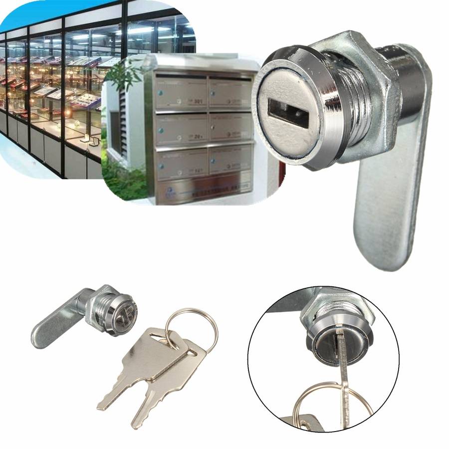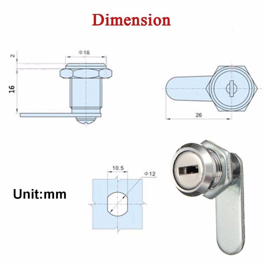 Features: a Cam locks provide high security b Main material:Zinc Alloy c Finish:Chrome,bright nickel d. Stop cam loose fit e. Comes with two key f. Key can only be removed in the locked position g. 2 keys on a ring included for each lock h. Head diameter: 16mm i. Application:For toolbox,mailbox,filling cabinets,boxes and other instruments. Package Included: 1 x Cam lock 2 x Keys