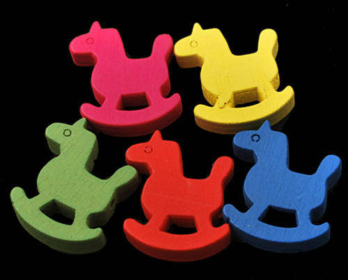 17MM WOOD-CUT ROCKING HORSE BEADS - ASSORTED COLOURS (SOLD IN PACK OF 10 BEADS)
