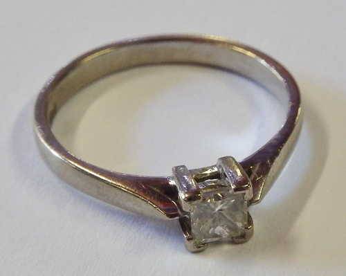 18 Ct white gold engagement ring with princess cut diamond 4 mm x 4 mm - Size K and a half