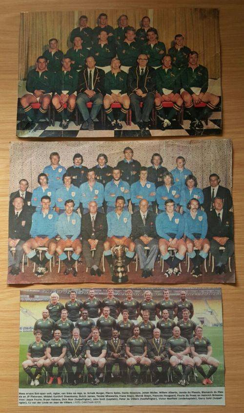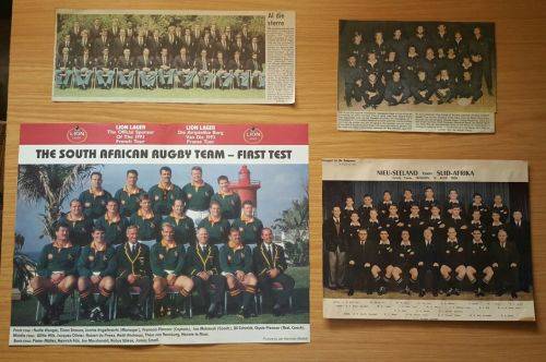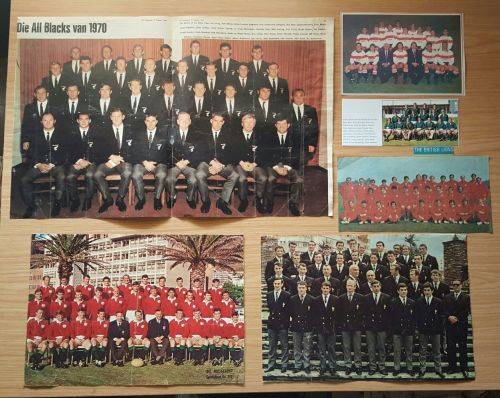 Below : 'Huisgenoot' magazine centre fold page (500mm x 330mm) of the 1970 All Black touring team to South Africa, 1990's Transvaal team (200mm x 140mm), SA team vs the British Lions - 1st test 1980 (130mm x 80mm), 1971 British Lions team to New Zealand (newspaper picture 245mm x 125mm), 'Huisgenoot' magazine picture (330mm x 230mm) of the 1968 British Lions team who toured South Africa (names on a separate piece of paper), 'Huisgenoot' magazine picture (330mm x 230mm) of the 1967 French rugby team who toured South Africa.