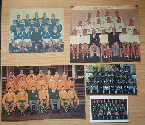 Below : 1963 Junior Springboks (225mm x 185mm - names on a seperate piece of paper), 1965 Orange Free State rugby team (285mm x 235mm), 'Huisgenoot' magazine picture (330mm x 210mm) of the Australian rugby team who beat the Springboks in the first test 1965, gloss photo (200mm x 120mm) of the first Springbok team under coaching of Rudolph Strauli, Postcard size photo of the Springbok team vs France 2005 in Paris.