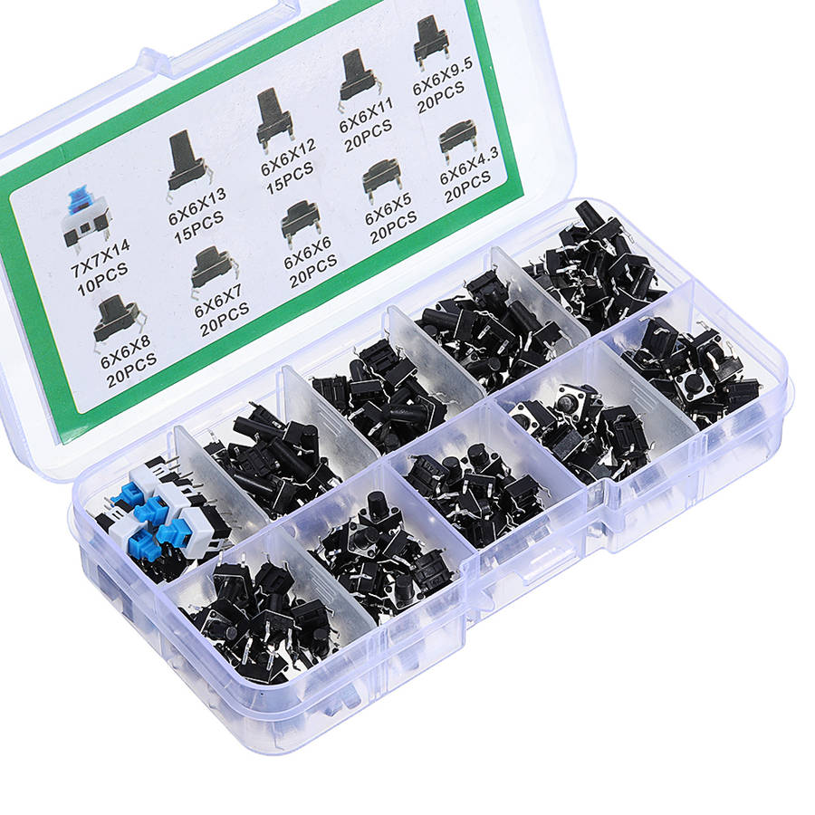 a High precision mechanism design offers perfect operation and long service life. a Package includes 10 values tact push button switch,total 180PCS. a 10 values: 6*6*4.3,6*6*5,6*6*6,6*6*7,6*6*8,6*6*9.5,6*6*11,6*6*12,6*6*13,6*6*14mm. a Great tool for television, audio equipment ,computer, interphone, remote control and other many filed.
