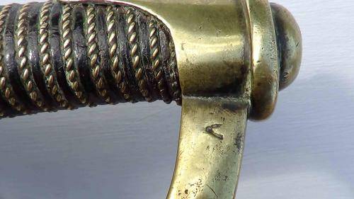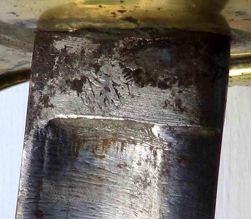 1822 French pattern "Bancal" Heavy Cavalry Sabre. Has "Cyrillic" markings on Blade and on Hilt as well as a "V" military marking on the hilt. The blade has obviously seen some "use" as there are a number of edge nicks. I have not cleaned this sabre in any way.