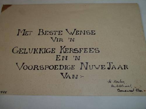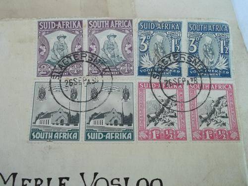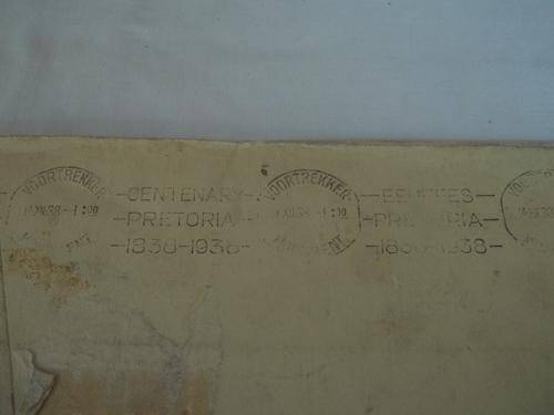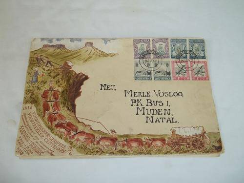 1838-1938 Voortrekker Centenary Commemorative cover of ox-wagon journey. The drawing and writing are original watercolours signed by W. H. Coetzee. There is a 7 cm tear on the envelope from the corner of the 1938 date towards the address. Also there is discolouring on the envelope and card. The stamps are in a good condition and have been franked at Slagtersnek on the 26th September 1938. On the back of the envelope there is a franking stamp as per the second image. Unfortunately the envelope has also come apart at the seams. Size 21.5 cm x 14.5 cm. Postage RSA R30.00