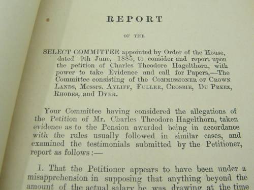 1885 Cape of Good Hope Report of the select committee on the petition of CT Hagelthorn regarding an increase in pension to the House of Assembly