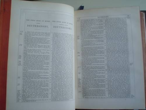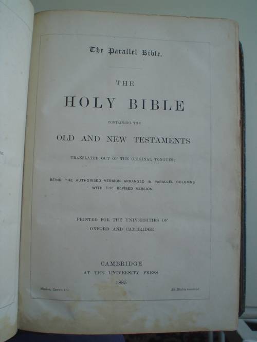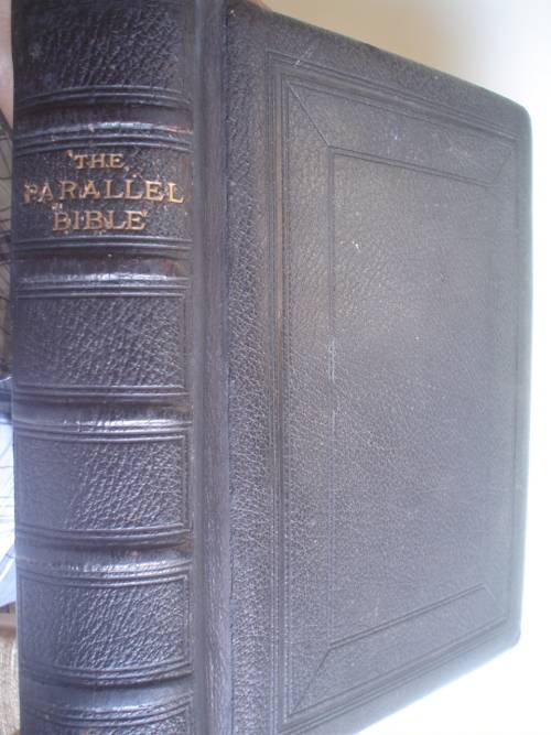 Holy Bible Parallel Bible in good condition. Some professional work done on the spine and it looks old an original. R80 postage in SA or R100 courier in SA. 27 cm tall, 21 cm wide and 5,5 cm thick. Inscription of previous owner in front. Good condition inside. Ou Bybel in engels, collectable Bible.