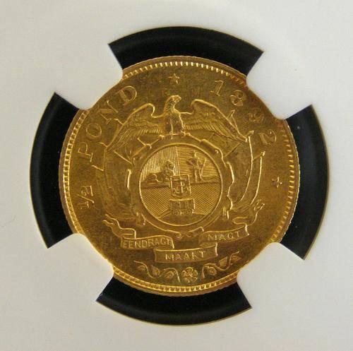 1892 PAUL KRUGER DOUBLE SHAFT HALF POND GRADED MS64. ONLY 4 COINS GRADED HIGHER, 3 AT MS65 AND 1 AT MS66. THIS COINS IS FOR THE HIGH END COLLECTOR.