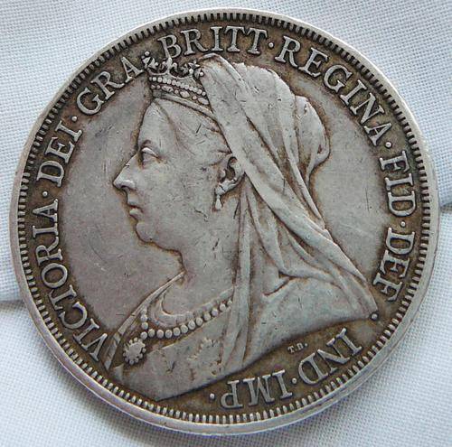 This 1893 issue of a British Crown, depicting Queen Victoria on one side and St. George slaying the Dragon on the other, was part of the 'NEW' coinage issued to Commemorate the Diamond Jubilee of Queen Victoria It is Sterling Silver and is in very good condition. It is 38 mm in diameter and weighs 28.3 grams.