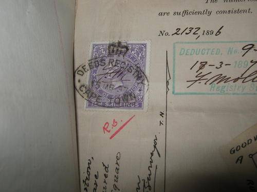 There are one pound, ten shillings, and two shillings revenue stamps at the top of the front page.