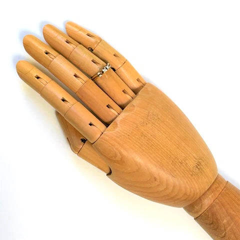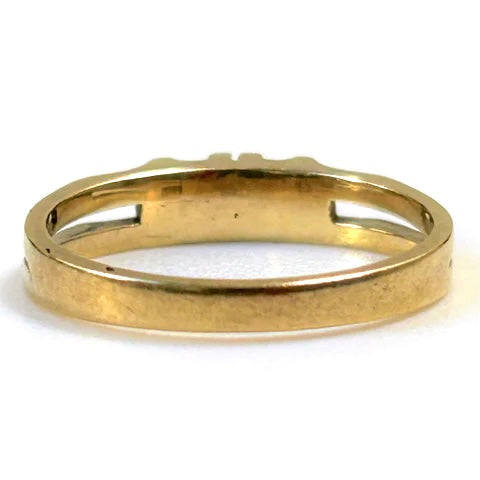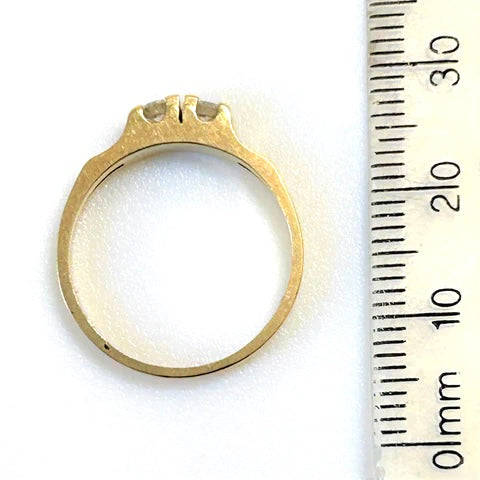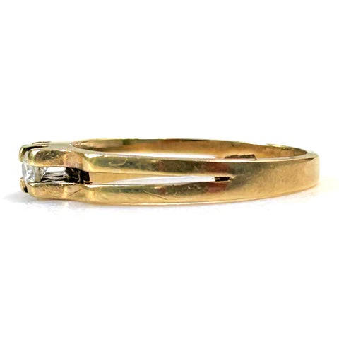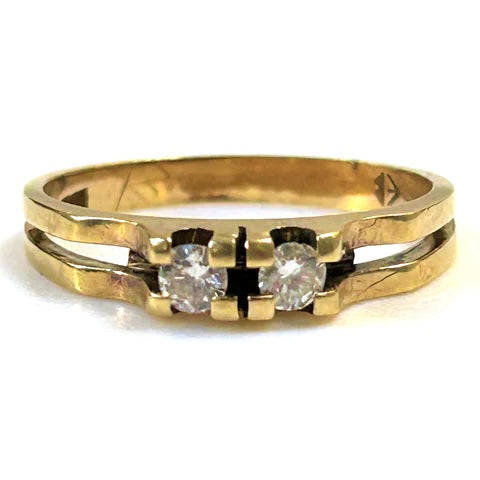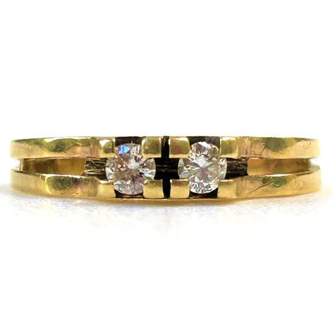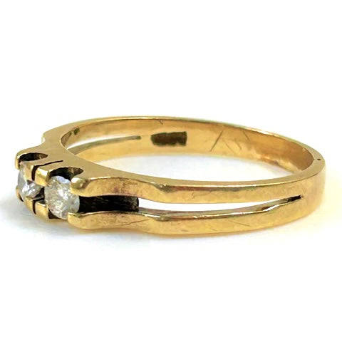 The vintage 18ct yellow gold ring has a shank that is bifurcated from the shoulders with each part built up to the front to form the claws holding two diamonds (approximately 2.9mm diameter circa 0.09ct each colour I J; clarity VS2) in line. The ring is marked "18CT".