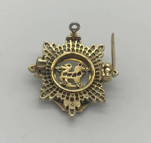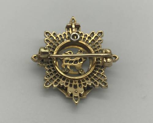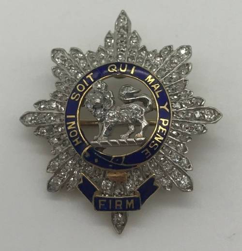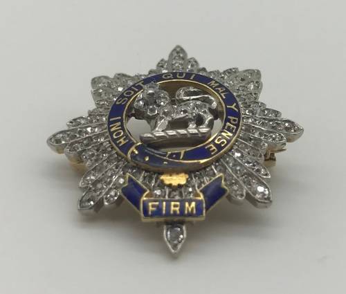 This exquisitely made, highly collectable 'Sweetheart' brooch/pendant, manufactured from 18ct yellow and white gold, is set with 116 'old cut' diamonds = 0.58ct J/K - SI and inlaid with blue enamel. It is inscribed with the French maxim - 'HONI SOIT QUI MAL Y PENSE', which when translated means, 'MAY HE BE SHAMED WHO THINKS BADLY OF IT'. The brooch is modelled in the form of the cap badge of the Worcestershire Regiment. It is in excellent condition and measures 2.5cm in diameter and weighs 5.7g.