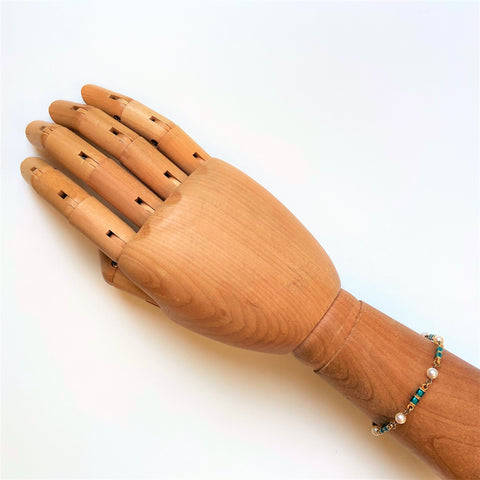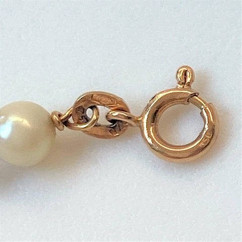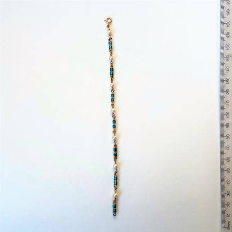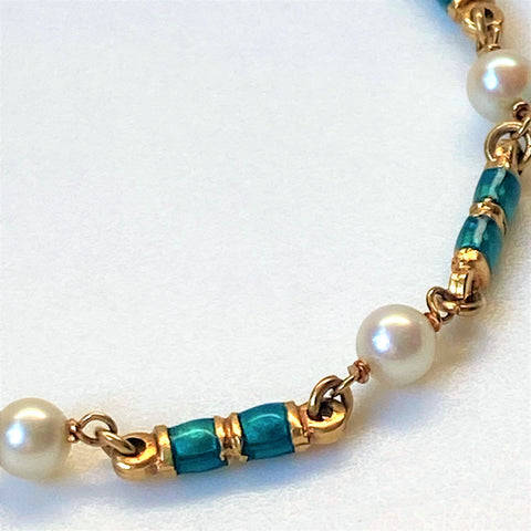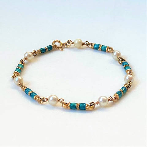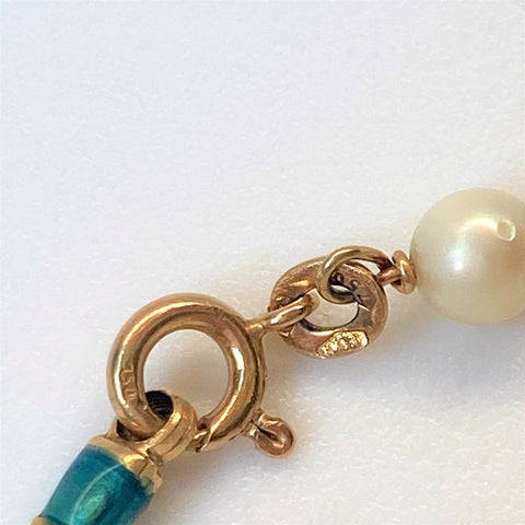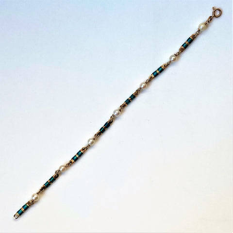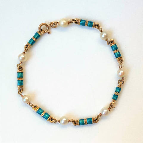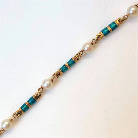 The vintage 18ct yellow gold bracelet is made up of seven pearls (approximately 5mm diameter; round; minor blemishes; good lustre; light cream with faint pink overtones) joined by seven elongated gold links decorated with emerald green enamel. The bracelet has a bolt ring closure. The bracelet is marked 750 indicating 18ct gold. It also has marks which appear to be 18 AR; FAO. The marks could be Italian marks.
