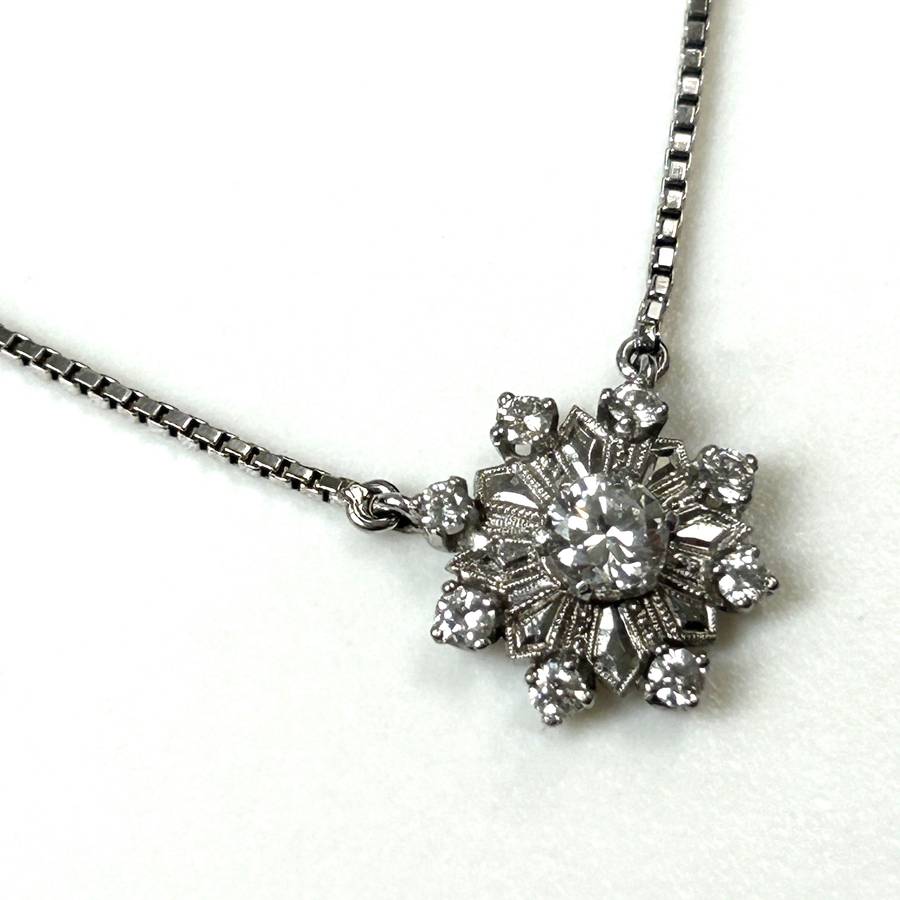 The vintage, 18ct white gold necklace has a snowflake-shaped centrepiece, which has bead and groove decoration, and which is claw-set with nine round, brilliant-cut diamonds. The central diamond is approximately 5mm diameter (circa 0.5ct; colour G-H; clarity VS). This is surrounded by eight smaller diamonds (circa 0.06ct each). The centrepiece is joined to two sections of fine box chain which end with a bolt-ring and loop closure. The necklace is marked "750" and has other, probably Italian, marks.