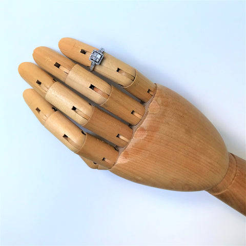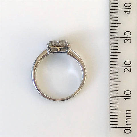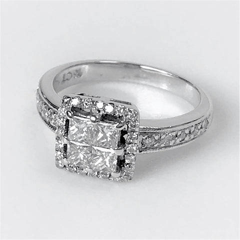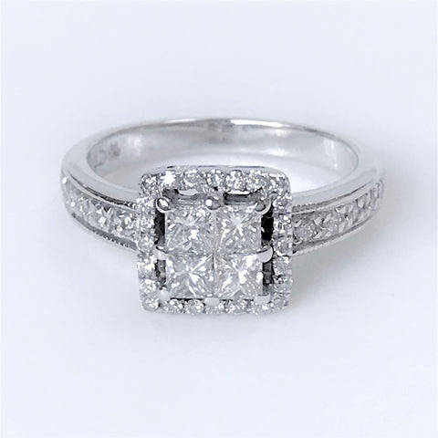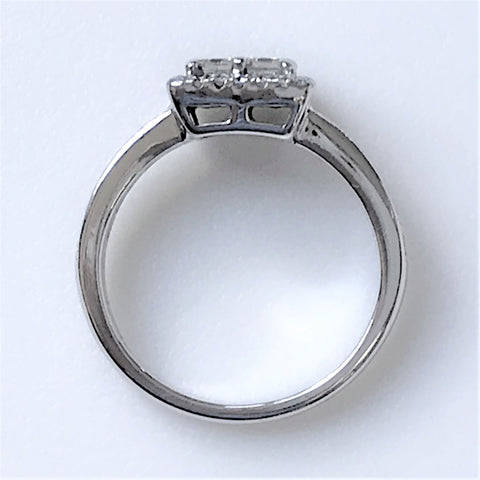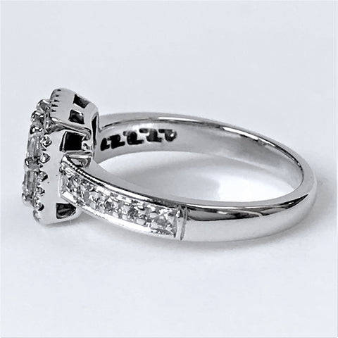 The modern 18ct white gold ring has a square head and is set with 38 diamonds. Four of the diamonds that are set in the head, are square-cut, and in a square arrangement (circa 0.065ct each; colour approximately I-J; clarity VS2). These four central diamonds are surrounded by 24 small round-cut diamonds and there are another five small, round-cut diamonds on each shoulder (small diamonds circa 0.17ct in total). The ring is marked 18CT.