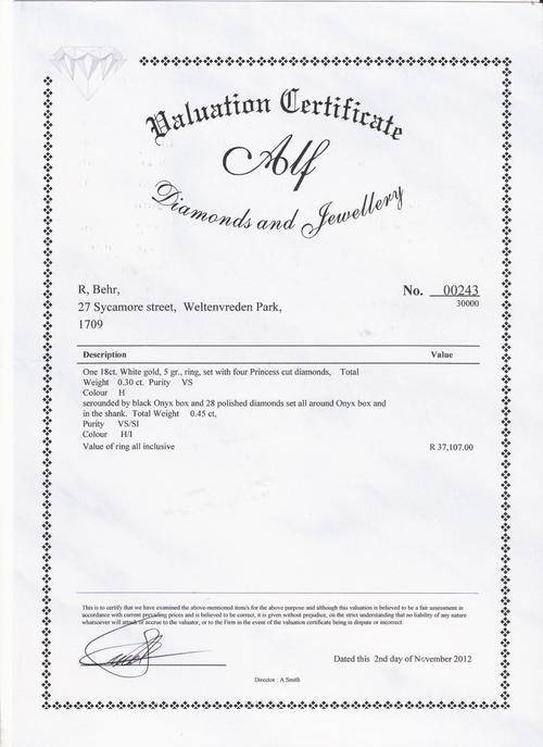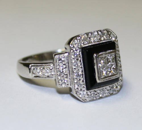 18ct White Gold Ring with Diamonds and Onyx. Valuation certificate included