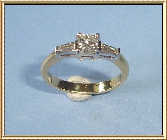 A BEAUTIFUL PRINCESS CUT EYE CLEAN EXCELLENT NEAR COLOURLESS Natural DIAMOND ( app. 0.35ct ) RING with TWO TAPERED BAGUETTES ( app. 0.10ct ) SET in 18ct YELLOW and WHITE GOLD.