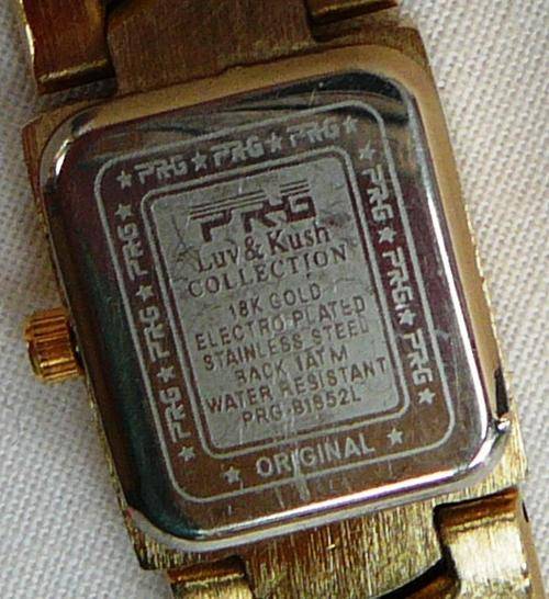 This extremely Elegant Ladies Watch is stamped on the back PRG LUV & KUSH COLLECTION 18K Gold Electroplated Stainless Steel Back 1ATM Water Resistant PRG-B1852L. It has had a new battery fitted on 27 June 2014. The watch is 210 mm long and 15 mm wide it weighs 73 grams.