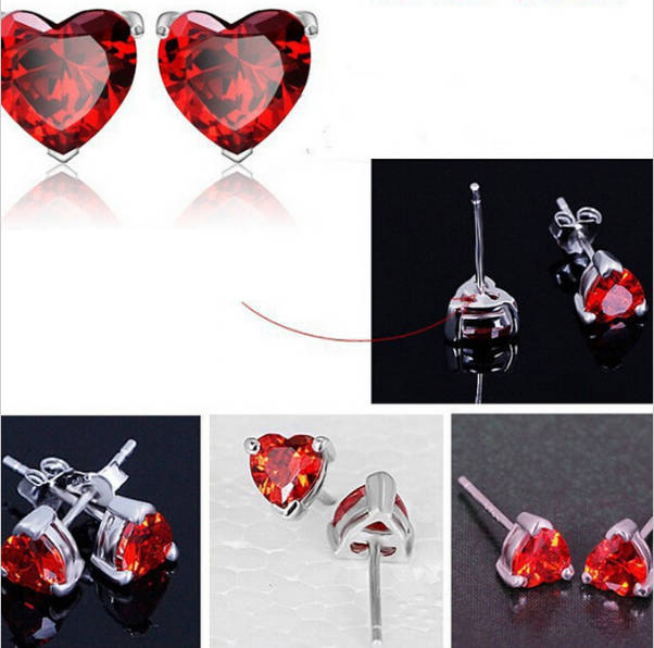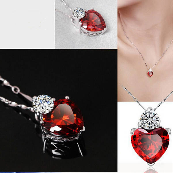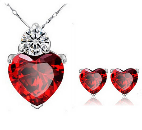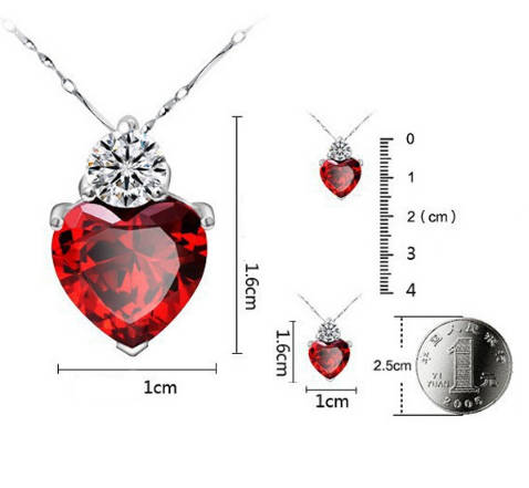 18K White Gold Plated CZ Luxury Ruby Heart Necklace and Earrings.In Golden Gift Box