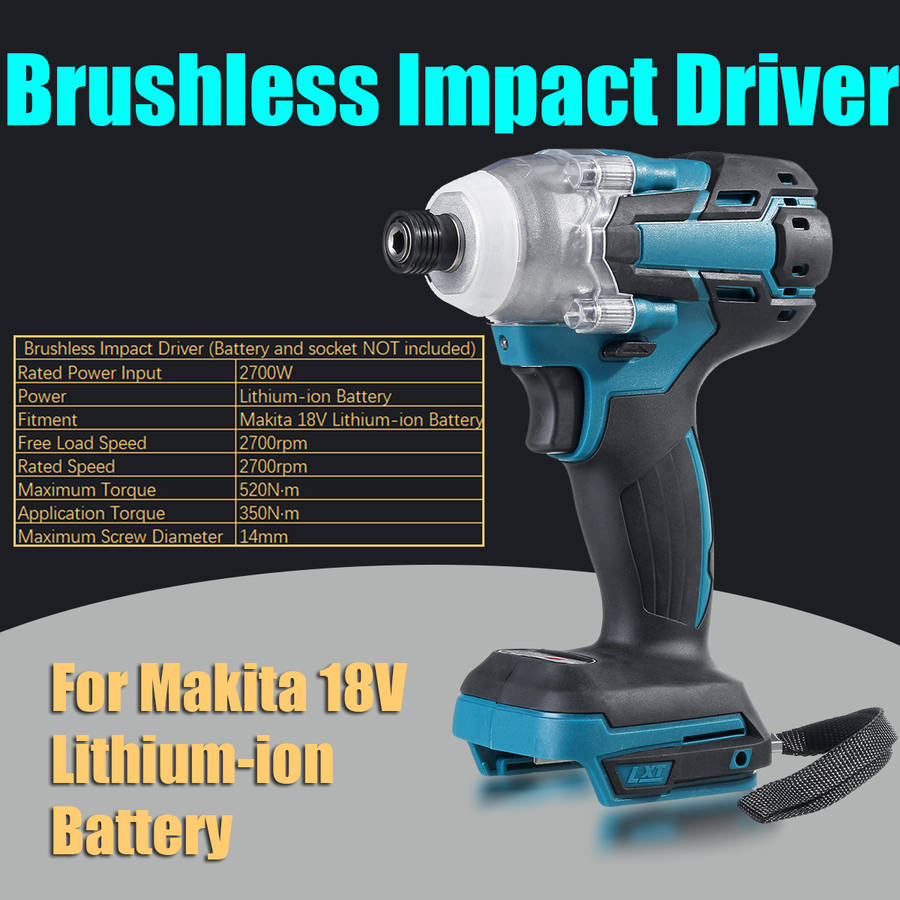 Specifications Type: Brushless Impact Driver Power: Lithium-ion Battery (NOT Included) Fitment: Makita 18V Lithium-ion Battery (NOT Included) Free Load Speed: 2700rpm Rated Speed: 2700rpm Maximum Torque: 520Nm Application Torque: 350Nm Maximum Screw Diameter: 14mm Features - Practical, delicate and durable! - The handle is wrapped up with artificial leather to prevent slipping. - Powerful motor produces 350Nm of torque for heavy applications and up to 520Nm maximum. - Ergonomic soft grip handle & compact size. Package Included 1 x Impact Driver (Battery and socket NOT included)
