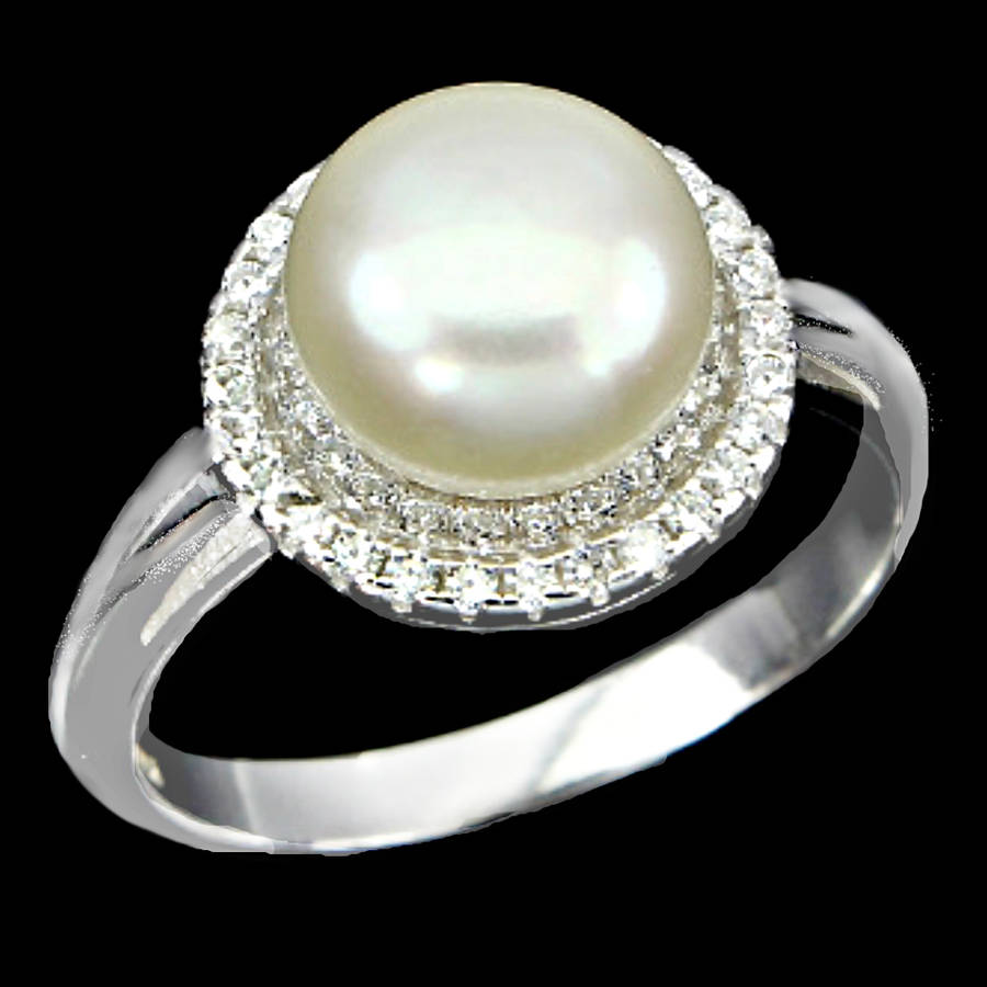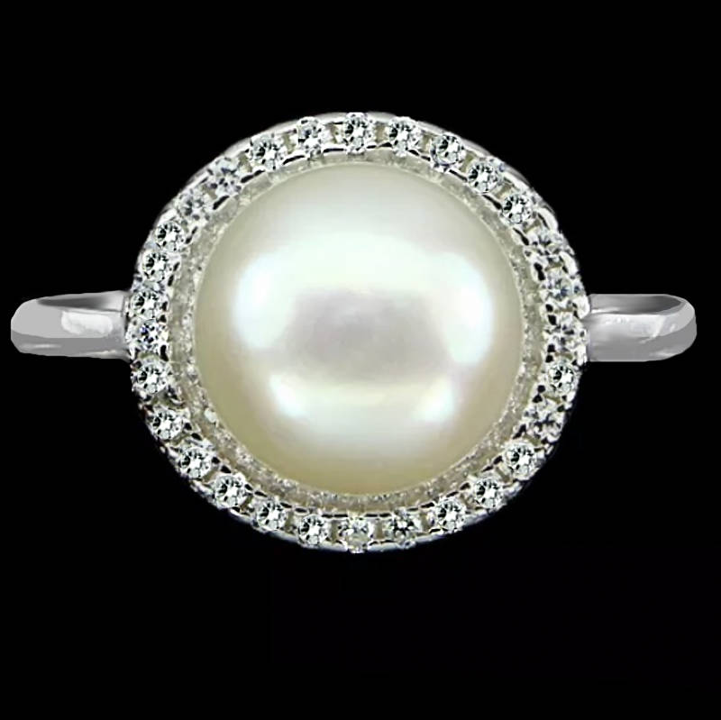 HANDMADE NATURAL WHITE PEARL AND WHITE CUBIC ZIRCONIA FINE RING SIZE US 7 / P
