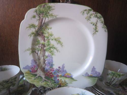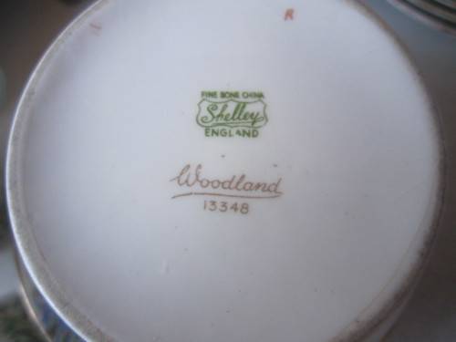 The set is called "Woodland"registration number 13348, the sugar bowl has 3 small hairline cracks on the inside bottom but they do not go right through so it will be fine to use. I would say this set is circa 1950'to 60's. There is some wear to the gold guilding on the edges but otherwise items look good to go.