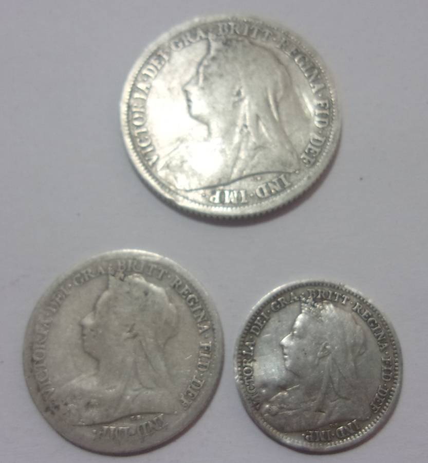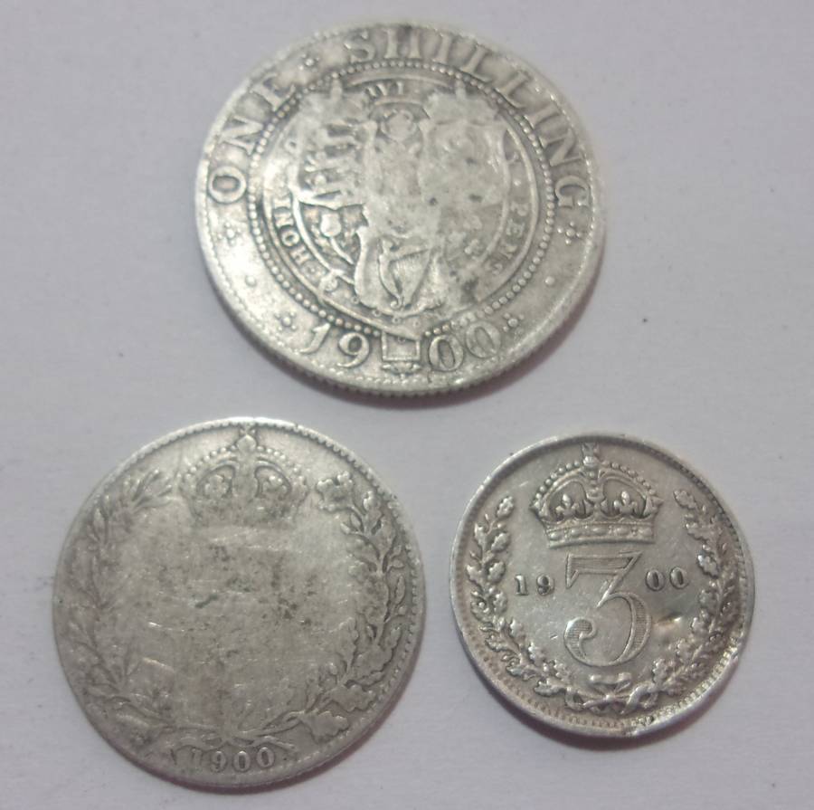 1900 Victoria British Sterling silver coin set - 1 Shilling to 3p. This British .925 silver coin set consists of a One Shilling, Sixpence and Three.Pence coin. Great buy - 1 bid for the set. 3p Coin has some damage.