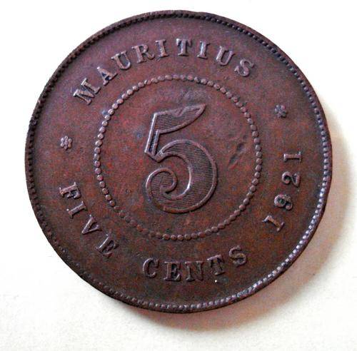 1921 MAURITIUS 5 CENTS GEORGE V KING AND EMPEROR OF INDIA BRONZE