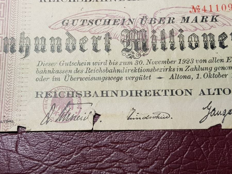1923 City of Altona (Prussian Province of Schleswig-Holstein) 100 000 000 Mark Reichsbahndirektion 1923 City of Altona (Prussian Province of Schleswig-Holstein) 100 000 000 Mark Reichsbahndirektion 1923 City of Altona (Prussian Province of Schleswig-Holstein) 100 000 000 Mark Reichsbahndirektion
