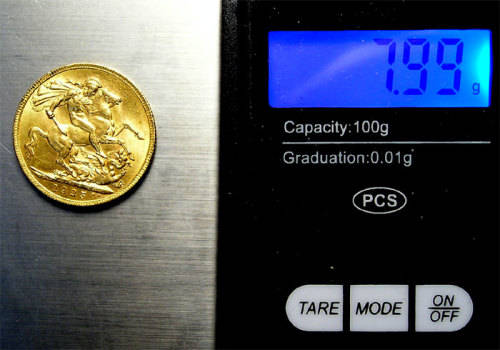 A British Sovereign weighs 7.98 gm and is made of 22ct gold for an actual pure gold content of 0.235 troy ounces.