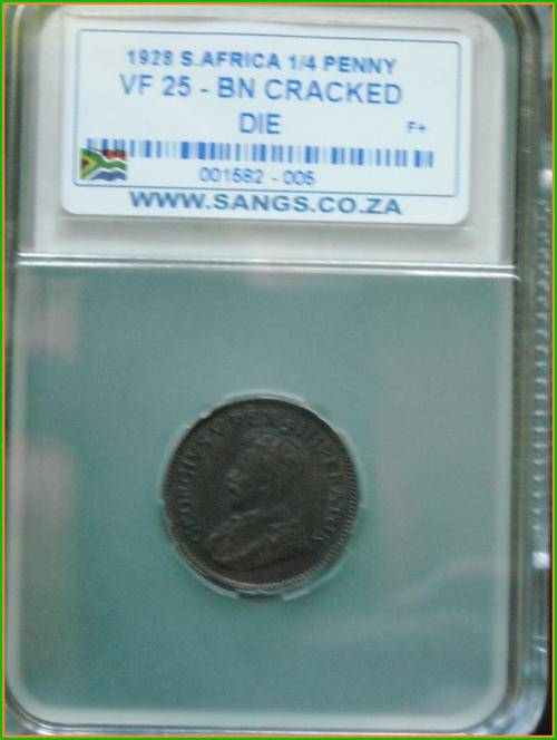 1928 SA Union Quarter Penny # SANGS VF 25 BN # CRACKED DIE